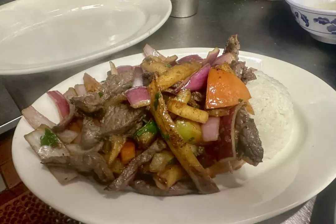 This classic Peruvian dish features beef stir-fried with soy sauce, accompanied by seasoned French fries, tomatoes, cilantro, red onions, and a bowl of white rice. The restaurant also offers a complimentary serving of spicy green sauce that you can drizzle over your meal.